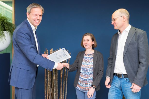 Prof dr. John Groten (managing director) transfers Certificate of Approval ISO13485:2016  to Dr. Kristiane Schmidt (Program Manager IVD) and Dr. Rik de Wijn (Head of Diagnostic Assay Services).